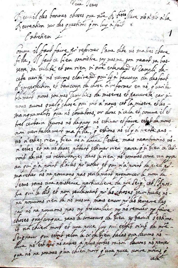 Nous avons une sœur céans qu’il y a bien vingt-quatre ans qu’elle chemine dans une voie de si grand dénuement que jamais elle n’a ni lumières ni pensées sur aucun mystère ni sur choses quelconques, et, s’il lui en venait, elle dit qu’elle pense qu’elle s’en détournerait pour tenir, comme elle fait, son esprit très simplement arrêté en Dieu. Et est si fidèle en cet exercice qu'elle est toujours là, ou du moins, rarement et courtement est-elle distraite, que sitôt qu'elle s'en aperçoit elle se remet là. Jamais non plus, elle n'est portée à rien demander à Notre Seigneur, ni rien désirer ni s'unir ni faire aucun acte de quoi que ce soit, ni ne pense à en faire ni si elle en doit faire, seulement, elle se prosterne le matin comme pour faire un acte d'adoration que notre Bienheureux Père lui a dit de faire, avec quelque oraison jaculatoire, pendant les octaves des grands mystères. Elle le fait sans goût ni se divertir de sa simple attention et, de même, entend les sermons et ses lectures sans autre attention que de retenir quelque chose pour l'entretien d'après vêpres. Au bout, c'est une âme totalement fidèle à la suite du bien et exacte à la moindre plus petite observance.